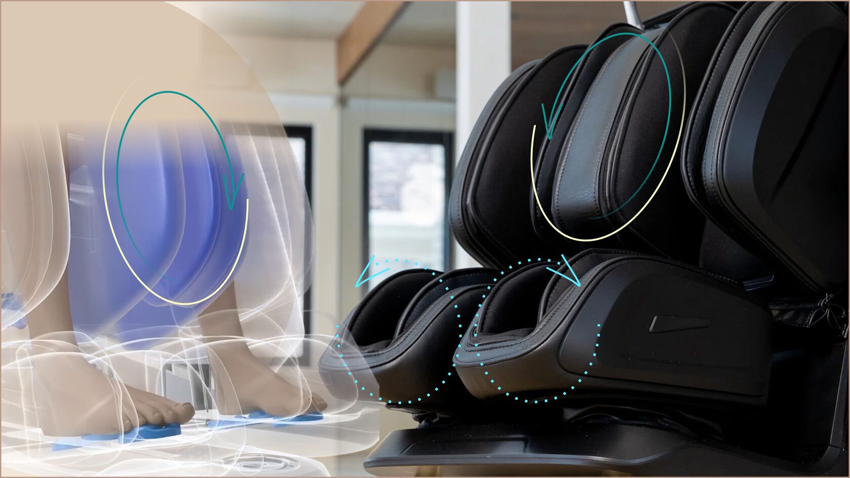 Революционная система вращения стоп с ротационным массажем голеней и стоп! Забудьте об усталости и напряжении! Чувствительный механизм кресла точно определит длину ног и Grottesk сделает вам полноценный растирающий и роликовый массаж икроножных мышц в двух направлениях, прорабатывая роликами стопы. Уникальная система ротационного массажа синхронизирует вращение голеностопного сустава с глубоким массажем икроножных мышц. Мягкие, но динамичные вращательные движения голеностопных суставов помогут снять напряжение и улучшить баланс и гибкость суставов, обеспечивая невероятное расслабление и быстрое восстановление, чтобы каждый шаг стал более легким и естественным.