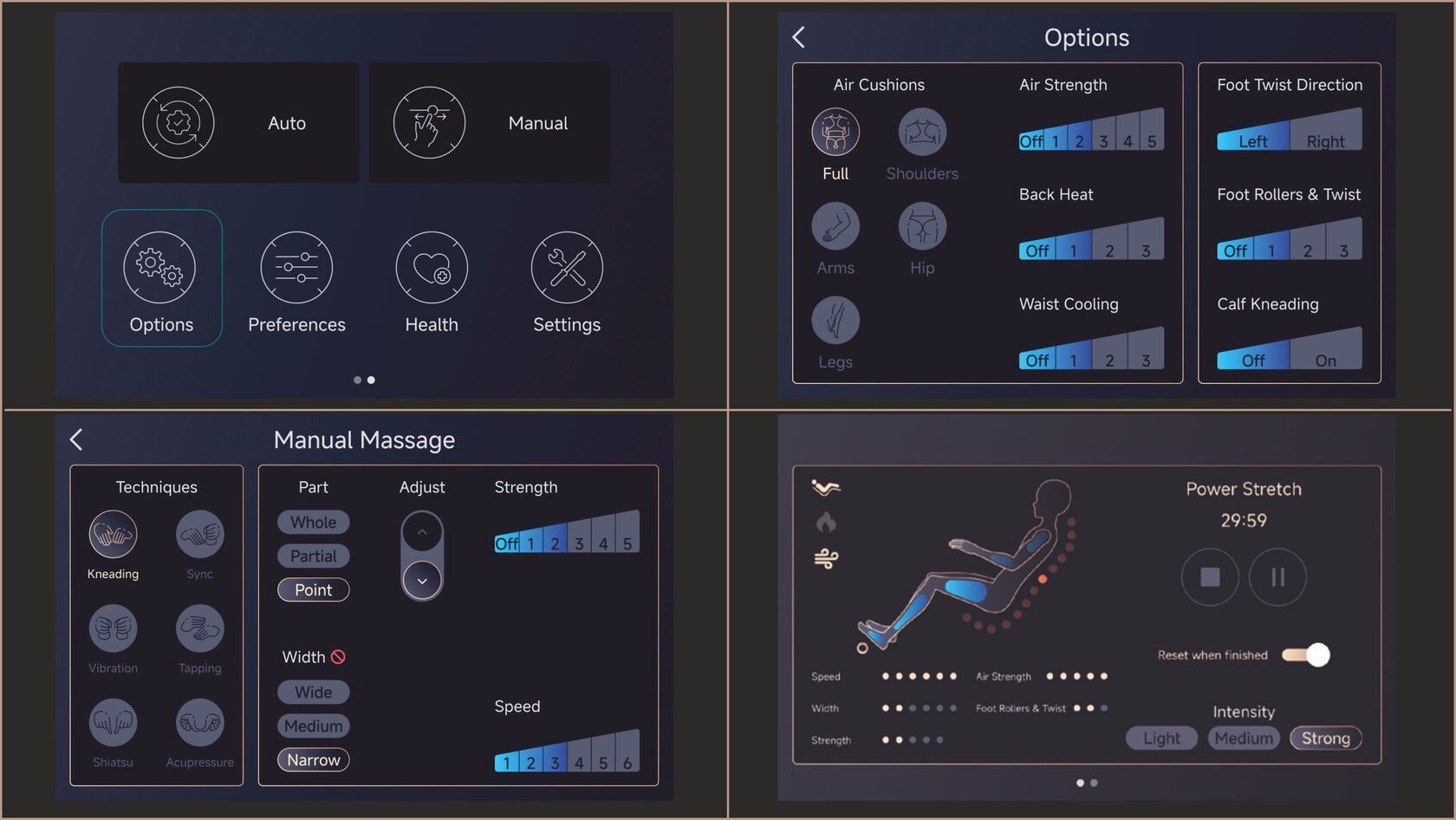 Сенсорный 7-ми дюймовый пульт и дополнительная панель управления Управляйте массажным креслом и пользуйтесь его расширенными возможностями с помощью интуитивно понятного 7-ми дюймового сенсорного экрана. А во время самой терапии комфортно управляйте креслом с помощью панели на подлокотнике. Такое управление повышает удобство использования, позволяя легко перемещаться по программам и их настройками, персонализируя свой массаж.